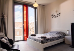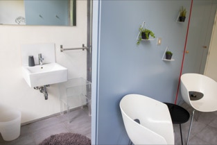 Salle de bain, toilettes et placard sont cachés derrière le mur rouge.
